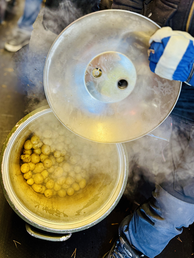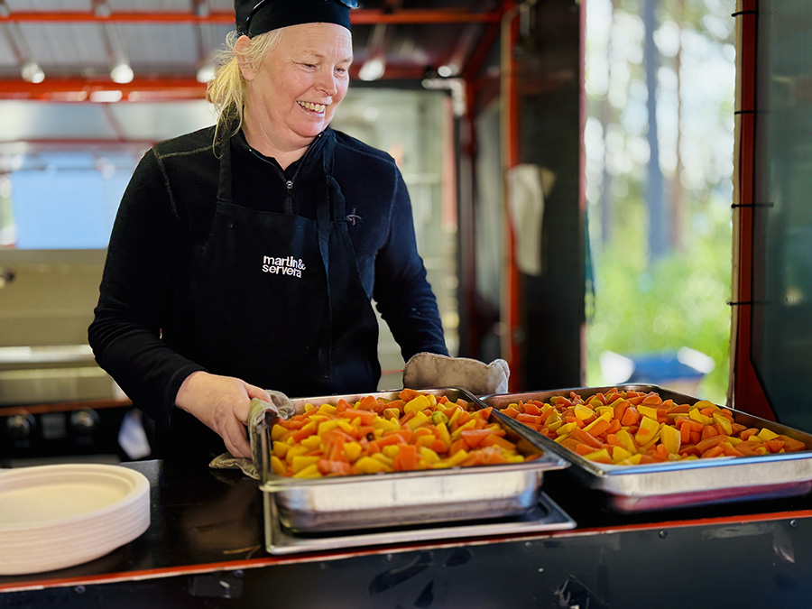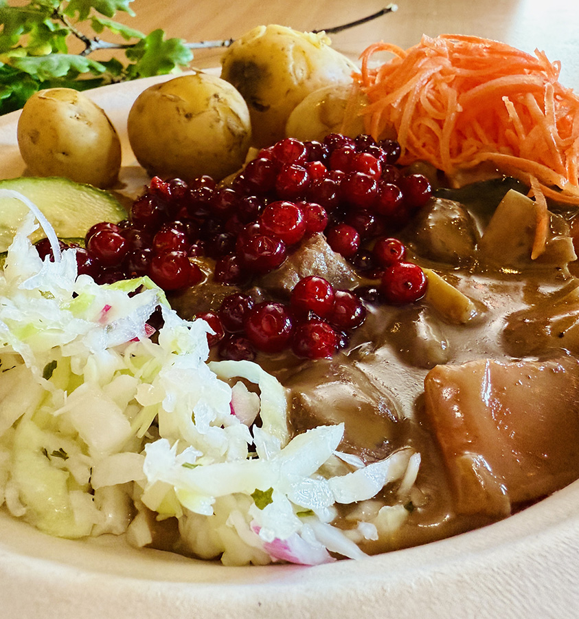 – Idag har vi lagat kokt potatis från Malungsfors, satt i juni och plockad i fredags. Vi serverar älggryta på kött från Venjan, skjuten av en jägare från Älvdalen, och rårörda lingon från Malungsskogarna, berättar han entusiastiskt.