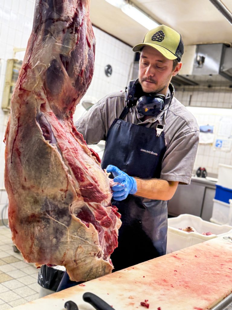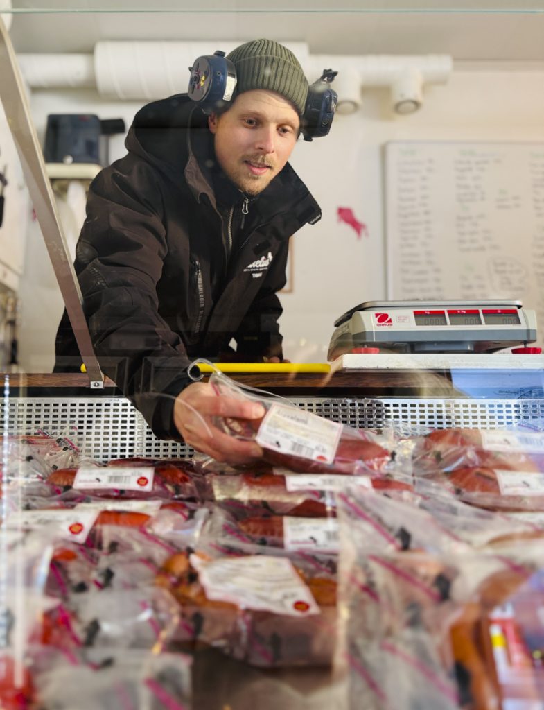Under jaktsäsongen lämnar lokala jaktlag in älg och björn som besiktas, styckas och förädlas. Inför jul ökar trycket: skinkor rimmas, prinskorv stoppas och diskarna fylls med kallskuret.